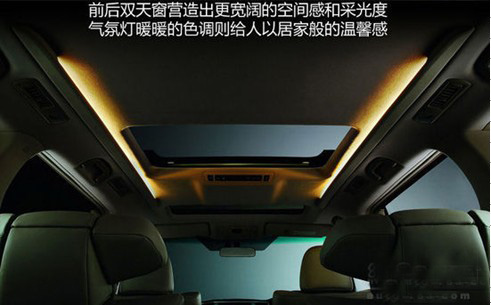 作為行政級(jí)的MPV,豐田Alphard分別為前排和后排乘客提供了兩個(gè)可以分別開(kāi)啟的雙天窗,營(yíng)造出更為寬闊的空間感和良好的采光度。此外,在車(chē)頂兩側(cè)還設(shè)置氣氛燈,暖暖的色調(diào)給人以居家般的舒適和放松。