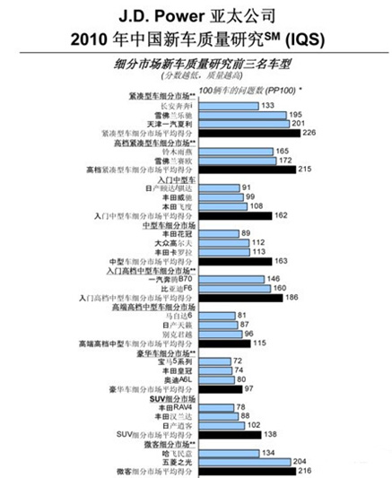 近日,J.D. Power亞太公司公布了2010年中國(guó)新車質(zhì)量調(diào)研報(bào)告,其中一汽豐田的五款主力車型皆表現(xiàn)優(yōu)異,旗下的COROLLA EX花冠和RAV4分別在中型車和SUV車兩個(gè)細(xì)分市場(chǎng)摘得桂冠,且皇冠、卡羅拉與威馳也分別以優(yōu)異成績(jī)占據(jù)豪華車、中型車、入門中型車的前三名,幾乎每種車型的前三名都可看到豐田的身影,豐田再次以扎實(shí)的真功夫,過(guò)硬的質(zhì)量領(lǐng)跑國(guó)內(nèi)車市。