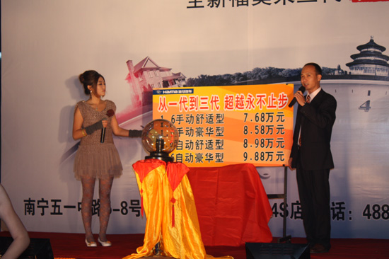 2010年11月20日20點(diǎn),福美來(lái)三代南寧上市發(fā)布會(huì)在航洋國(guó)際購(gòu)物中心舉行,意味著這款全新中級(jí)家轎正式登陸南寧車市。發(fā)布會(huì)主辦方南寧海馬?凳昀吓4S店為此做了精心準(zhǔn)備,使得上市發(fā)布會(huì)精彩紛呈。此次,全新福美來(lái)三代共推出4個(gè)型號(hào),市場(chǎng)指導(dǎo)價(jià)分別為1.6L手動(dòng)舒適型 7.68萬(wàn)、1.6L手動(dòng)豪華型8.58萬(wàn)、1.6L自動(dòng)舒適型8.98萬(wàn)、1.6L自動(dòng)豪華型9.88萬(wàn)。