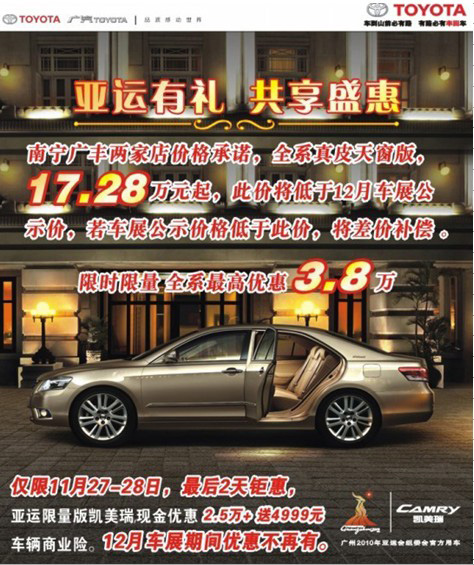 為了讓廣西眾多消費(fèi)者能在12月國(guó)際車展前最大化的享受車價(jià)優(yōu)惠,擁有自己夢(mèng)寐的豐田生活,廣汽豐田迅利江南店鄭重承諾,在11月27-28日,凱美瑞最低售價(jià)17.28萬(wàn)元起,若12月國(guó)際車展公示價(jià)格低于此價(jià),將差價(jià)補(bǔ)償,活動(dòng)僅限2天;同時(shí)廣汽豐田全系車型限時(shí)限量,最高鉅惠3.8萬(wàn)元,機(jī)會(huì)難得!