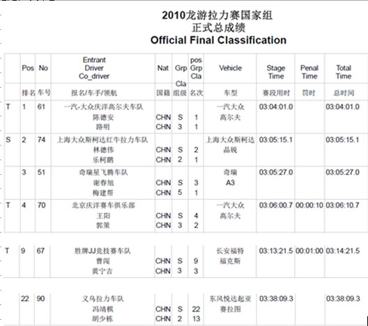 2010年全國汽車?yán)﹀\標(biāo)賽浙江龍游站暨FIA亞太汽車?yán)﹀\標(biāo)賽落幕,備受關(guān)注的CRC CAR組別最終由奇瑞星飛騰車隊及其賽車奇瑞A3衛(wèi)冕成功,由此奇瑞星飛騰車隊也成為CRC CAR歷史上的首個兩連勝得主。