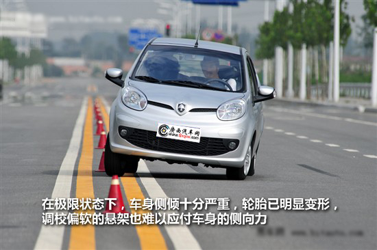 在日常駕駛中,奔奔MINI表現(xiàn)的比較從容舒適。電動轉(zhuǎn)向助力系統(tǒng)帶來的是非常輕便的方向盤,同時也削減了轉(zhuǎn)向時的反饋力,比較適宜女性駕駛。但是在靜止時,方向盤的助力顯得比較沉重,感覺并不比普通液壓助力車型力度輕。也許是出于安全考慮,方向盤在中間位置需要的轉(zhuǎn)向力比較大,在你想要微調(diào)時會出現(xiàn)力量小沒反應(yīng)、力量大又調(diào)整過頭的情況,顯得有些神經(jīng)質(zhì)。調(diào)校很軟的懸架能很容易地過濾掉路面?zhèn)鱽淼恼饎,只是在轉(zhuǎn)向時側(cè)傾比較大,建議拐彎時提前降低車速。