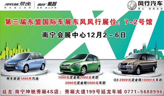 12月2-6日,風(fēng)行汽車南寧坤馳店將亮相第三屆東盟車展7-2號(hào)館,屆時(shí)恭候您的光臨,電話預(yù)約看車就可免費(fèi)領(lǐng)取車展門票,數(shù)量有限,先到先得;現(xiàn)場(chǎng)看車,風(fēng)行環(huán)保袋、剃須刀、風(fēng)行雨傘、風(fēng)行飲水杯、仿真車模型等眾多禮品等你來(lái)拿,趕緊電話預(yù)約吧,南寧坤馳秀廂4S店0771-5688996,南站4S店0771- 4866322。