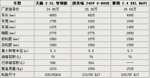 我們選取的三款車型都是位于該車系中黃金排量的頂配車型,售價在25萬-28萬這個價格區(qū)間。在車身尺寸方面四款車型不相上下,相對凱美瑞和雅閣來說天籟則略顯秀氣,車寬和車高都最小的。在軸距方面,雅閣達(dá)到了2800mm,是三款車型中最大的,使得它的內(nèi)部空間相對另外兩款車型更加寬敞。同時雅閣的前后輪距和和輪胎寬度也是三款車型中尺寸最大的,保障了其優(yōu)秀的操控性能。三款車型均配備了70升大小的油箱,足以滿足人們?nèi)粘3鲂泻投掏韭糜蔚男枨蟆?