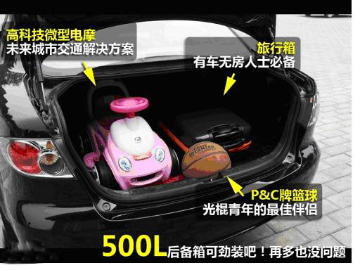 與其它車型相比,馬自達6的最大優(yōu)勢是空間寬敞。身高181CM的乘客坐在車里絲毫不覺得擁擠,后排座椅也可以輕松的坐下三個成年人。后備箱的空間達到500L,便于存放物品。