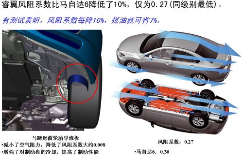 從節(jié)油性能上看,更為合理的車身設(shè)計使得睿翼2.0L在車身比第一代Mazda6大大加長的情況下車身自重更輕,與此同時,在不犧牲后排空間及乘坐舒適性的同時實現(xiàn)了0.27的同級別最低風(fēng)阻系數(shù)。