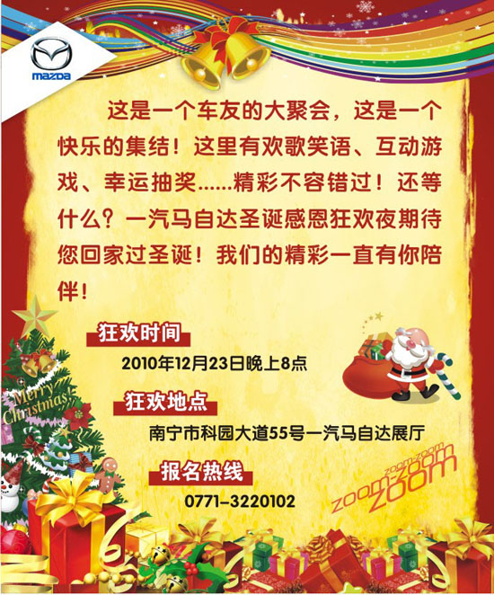 這是一個車友的大聚會,這是一個快樂的集結(jié)!這里有歡歌笑語、互動游戲、幸運抽獎……精彩不容錯過!還等什么?一汽馬自達圣誕感恩狂歡夜期待您回家過圣誕!我們的精彩一直有你陪伴!