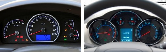 三炮筒形的儀表盤再次證明了科魯茲的運(yùn)動(dòng)風(fēng)格,并且還鑲嵌了時(shí)尚的銀色邊,配合藍(lán)色的背光十分時(shí)尚。悅動(dòng)的設(shè)計(jì)則很樸實(shí),大大的時(shí)速表和轉(zhuǎn)速表,右側(cè)為油量表和水溫表,其他車輛信息則在中間的液晶屏中顯示,簡(jiǎn)單也易懂。