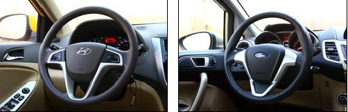 在兩車內(nèi)部的視野上,瑞納要優(yōu)于嘉年華的表現(xiàn)。嘉年華的前風(fēng)檔和前機(jī)艙線條比較傾斜,一定程度上減小了風(fēng)阻,但坐在車內(nèi)的前排乘客很難清晰地看到前機(jī)艙的左右兩角,容易錯誤估計與前車尾的距離。瑞納則沒有出現(xiàn)這種問題,前面的視野相對比較開闊。
