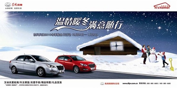 12月22日就是冬至日,北半球已經(jīng)處在寒冬。"天寒地凍愛(ài)車(chē)好動(dòng)",面對(duì)寒冬季節(jié),為讓風(fēng)神客戶充分感受風(fēng)神之"家"的陣陣暖意,東風(fēng)風(fēng)神南寧和順汽車(chē)銷(xiāo)售有限公司推出東風(fēng)風(fēng)神"溫情暖冬 滿意隨行"冬季服務(wù)月活動(dòng)。本次活動(dòng)將從今年12月20日開(kāi)始,持續(xù)到明年的1月20日。