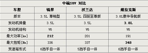 豐田-漢蘭達(dá)同樣搭載V6引擎,排量也同為3.5升,但可能是出于品牌的定位不同,漢蘭達(dá)給出的功率并沒有太高,201Kw的最大功率處于中間值。最大扭矩337N.m比起銳界優(yōu)勢微小,對比維拉克斯沒有競爭力。5速手自一體變速箱僅有漢蘭達(dá)一款車型使用,技術(shù)成熟穩(wěn)定,但對于動力輸出的控制略遜一籌。
