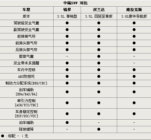 安全配置部分,由于車型推出的較早,現(xiàn)代-維拉克斯在膝部氣囊和安全帶提醒的部分呈現(xiàn)缺省狀態(tài);福特-銳界優(yōu)勢在于泊車輔助系統(tǒng),膝部氣囊還是沒有在這里出現(xiàn);豐田-漢蘭達整體安全配置較為齊全,三款車型中唯一一款將“膝部氣囊、安全帶未系提醒、陡坡緩降”三項功能全部應用的車型,安全部分漢蘭達小勝。