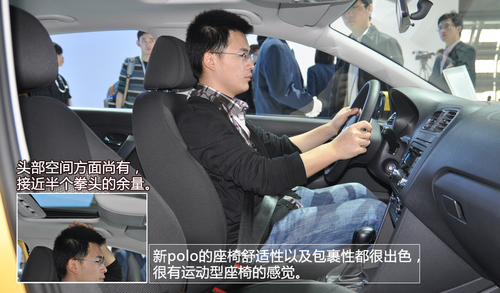 再來看看車內(nèi)空間方面。首先來看看新polo的車內(nèi)空間,新polo的座椅舒適性以及包裹性都很出色,很有運(yùn)動(dòng)型座椅的感覺。我們身高1.7米的體驗(yàn)者進(jìn)入車內(nèi)前排,頭部空間方面尚有接近半個(gè)拳頭的余量。