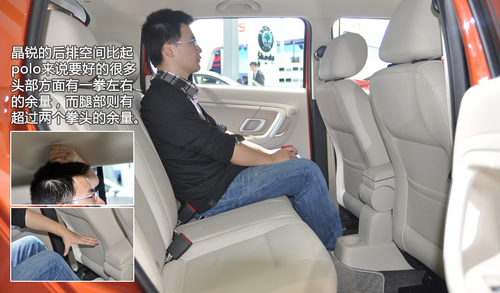 來到晶銳的后排,這里的空間明顯要比新polo敞亮不少。頭部方面有一拳左右的余量,而腿部則有超過兩個(gè)拳頭的余量。看來,和polo相比車身高度上超出的47mm空間,在這里發(fā)揮出了優(yōu)勢。