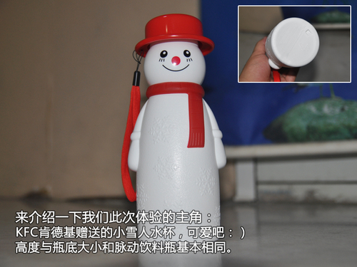 不過在開始之前,咱們先來認(rèn)識(shí)一下這次體驗(yàn)的主角:KFC肯德基贈(zèng)送的小雪人水杯,大眼睛紅帽子、紅圍脖,可愛吧:)!你可以把它想象成一瓶脈動(dòng)飲料瓶。因?yàn),高度與瓶底大小和脈動(dòng)飲料瓶基本相同。