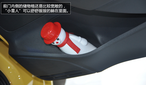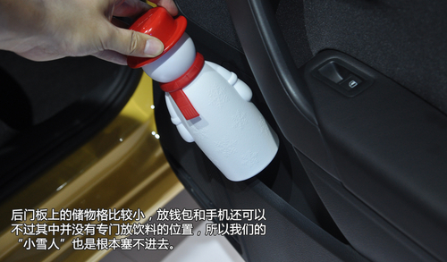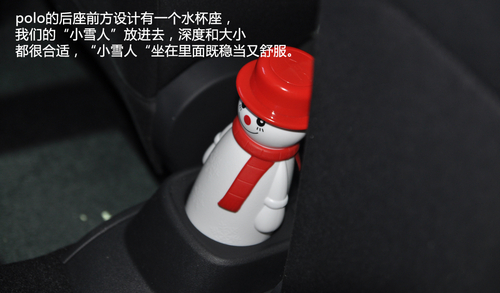 新polo的前門內(nèi)側(cè)的儲(chǔ)物格還是比較寬敞的,“小雪人”可以舒舒服服的躺在里面。另外,車內(nèi)擋把前方也設(shè)有水杯架,但是我們的“小雪人”根本塞不進(jìn)去。后門板上的儲(chǔ)物格比較小,放錢包和手機(jī)還可以不過其中并沒有專門放飲料的位置,所以我們的“小雪人”也是塞不進(jìn)去。polo的后座前方設(shè)計(jì)有一個(gè)水杯座,我們的“小雪人”放進(jìn)去,深度和大小都很合適,“小雪人“坐在里面既穩(wěn)當(dāng)又舒服。