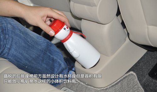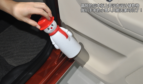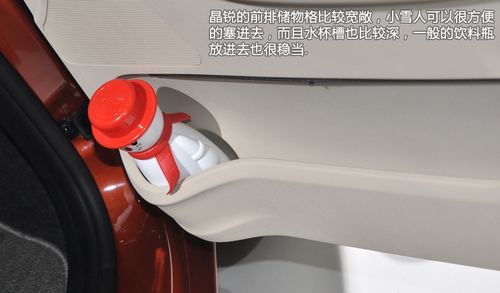 晶銳的儲(chǔ)物空間相比之下就比較寒酸了。盡管前排儲(chǔ)物格比較寬敞,小雪人可以很方便的放進(jìn)去,但是后座前方的水杯槽由于容積有限無法將飲料瓶放進(jìn)去,而后門版上干脆就沒有設(shè)計(jì)儲(chǔ)物空間。結(jié)果很明了,新polo在的儲(chǔ)物空間方面要比晶銳高出一籌。
