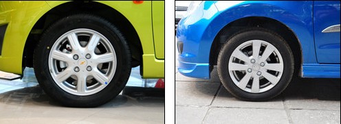 兩款車型都采用了155mm型號的輪胎,并且輪圈的尺寸同為R14,數(shù)據(jù)上的區(qū)別主要是在扁平比方面,當(dāng)然,5mm的差距不會帶來什么實際影響,這在外觀方面并不十分明顯,而鋁合金輪圈的漂亮程度絲毫也難分高下。