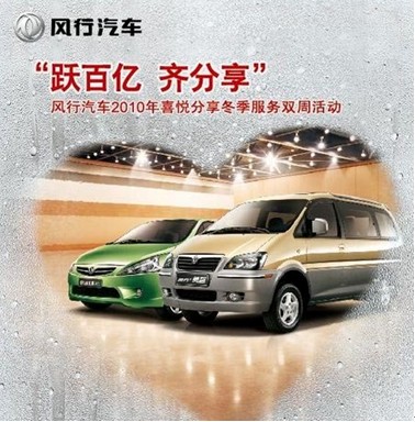 風(fēng)雨56年,2010年?yáng)|風(fēng)柳汽終于實(shí)現(xiàn)年銷售汽車超10萬(wàn)輛、年銷售收入超100億的歷史性突破;景逸1.5XL成功躍值上市,市場(chǎng)火爆。取得驕人的業(yè)績(jī)背后,離不開(kāi)廣大風(fēng)行用戶對(duì)風(fēng)行汽車的厚愛(ài)和支持。本著答謝廣大風(fēng)行用戶對(duì)風(fēng)行品牌厚愛(ài)和支持的宗旨,并幫助廣大車主在寒冷冬季安全出行,東風(fēng)柳汽攜手全國(guó)特約服務(wù)商開(kāi)展“躍百億齊分享”喜悅分享冬季服務(wù)雙周活動(dòng)。