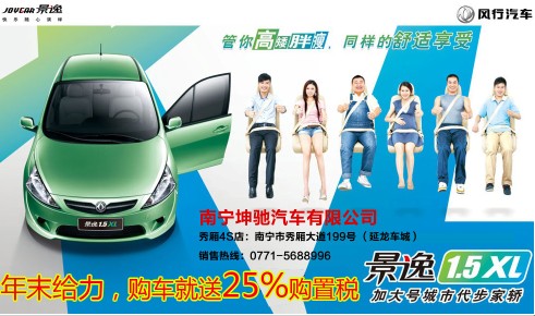 年末給力-購(gòu)景逸1.5XL就送25%購(gòu)置稅,風(fēng)行汽車南寧坤馳店讓你開(kāi)開(kāi)心心過(guò)大年,年后再提車,避免購(gòu)置稅回調(diào)所帶來(lái)的額外支出。