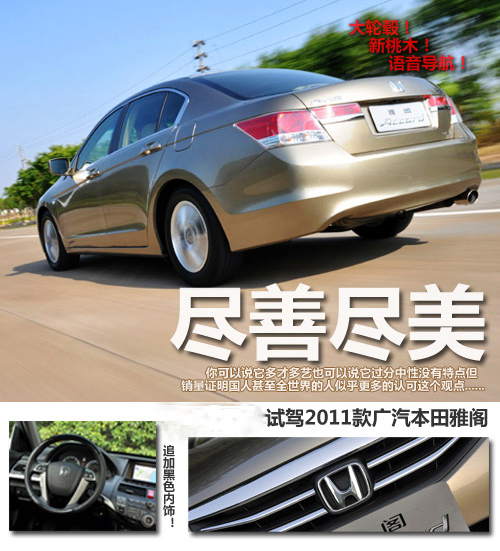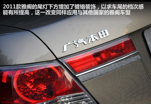 2011款雅閣的尾燈下方增加了鍍鉻裝飾,以求讓車(chē)尾的檔次感能有所提高,這一改變同樣應(yīng)用與其他國(guó)家的雅閣車(chē)型,本田技研的工程師告訴我們,本田在國(guó)內(nèi)車(chē)型上的標(biāo)準(zhǔn)是與全世界同步的。