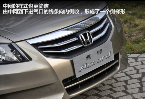 2011款的雅閣在外觀方面并沒(méi)有進(jìn)行大刀闊斧的改變,但仔細(xì)觀察之下你會(huì)發(fā)現(xiàn)它與奧德賽、歌詩(shī)圖越來(lái)越像,車(chē)頭從側(cè)面看上去不再那么平直,而產(chǎn)生了一些弧度。中網(wǎng)的樣式也更簡(jiǎn)潔,由中網(wǎng)到下進(jìn)氣口的線條向內(nèi)側(cè)收,形成了一個(gè)倒梯形,霧燈部分的線條處理更加強(qiáng)勢(shì),整體與老款車(chē)型相比更加霸氣。