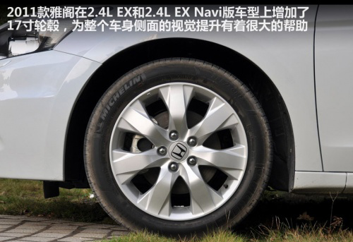 因?yàn)槲覀兡玫降脑囻{車(chē)是2.0L車(chē)款,所以并未使用17寸輪轂,2011款雅閣增加了使用17寸輪轂的車(chē)型覆蓋面,老款車(chē)型只有V6版本和2.4L頂配車(chē)型才用的17寸輪轂,本次也標(biāo)配于2.4L EX和2.4L EX導(dǎo)航版車(chē)型上。后視鏡的造型也得到優(yōu)化,保留較大的視野之余,空氣動(dòng)力學(xué)的改變也降低了行駛噪音的產(chǎn)生。