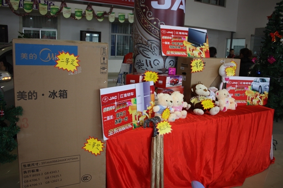 獎品分別為一等獎獎品是32寸彩色液晶電視,二等獎是美的雙開門冰箱一臺,三等獎是一個江淮汽車仿真車模!皡⒓舆@次的團(tuán)購活動我很開心,真是禮物不斷,驚喜不斷,很有意思”,當(dāng)天購車的李先生高興的說。