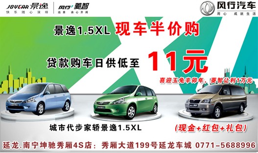 風(fēng)行汽車南寧坤馳4S店新推出購(gòu)車貸款計(jì)劃,助您提前享受美好有車生活,現(xiàn)在貸款購(gòu)車無(wú)需限制本地戶口、無(wú)需房產(chǎn)抵押、無(wú)需一次性購(gòu)買三年保險(xiǎn)、半價(jià)提車。而且時(shí)至年底,南寧坤馳特向廠家足量備貨,現(xiàn)在買車,現(xiàn)車現(xiàn)提,先到先選,詳詢5688996