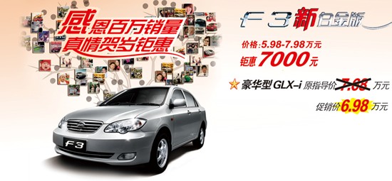 在新春佳節(jié)來(lái)臨之際,為答謝廣大消費(fèi)者一直以來(lái)的支持和厚愛(ài),比亞迪汽車特舉辦“感恩百萬(wàn)銷量,真情賀歲鉅惠”活動(dòng)。活動(dòng)期間,搭載日本原裝三菱4G15S發(fā)動(dòng)機(jī)的F3豪華型鋸惠呈現(xiàn)。冠軍配置、冠軍品質(zhì)、冠軍服務(wù),再加上超高的價(jià)值,直接刺激了F3在歲末車市的火爆,掀起了搶購(gòu)的狂潮。