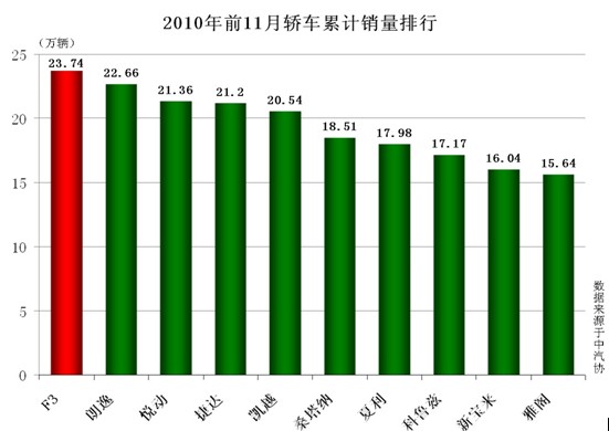 根據(jù)中汽協(xié)數(shù)據(jù)顯示,2010年1月-11月,比亞迪F3累計(jì)銷售23.74萬(wàn)輛,以明顯的優(yōu)勢(shì)榮膺單車銷售冠軍。F3在2010年前11月保持熱銷狀態(tài)并取得銷量冠軍的寶座,得益于冠軍般的品質(zhì),冠軍般的服務(wù)。年末的給力鉅惠,將使F3的冠軍地位更加不可動(dòng)搖。