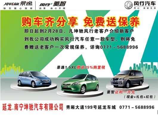 2010年,因?yàn)橛辛藦V大坤馳風(fēng)行客戶的大力支持,取得了矚目的成績(jī)。兔年伊始,為回報(bào)廣大老客戶的大力支持,特推出“購(gòu)車齊分享,免費(fèi)送保養(yǎng)”活動(dòng),即日起到2月28日,凡坤馳風(fēng)行老客戶介紹新客戶到我公司成功購(gòu)買風(fēng)行汽車任意一款車型,則將免費(fèi)贈(zèng)送老客戶一次常規(guī)保養(yǎng)。詳詢坤馳風(fēng)行:0771-5688996