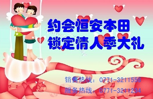 恒安本田精心為您準(zhǔn)備了節(jié)慶促銷大禮包。與最愛的人一起盡情享受浪漫情人節(jié)帶來(lái)的浪漫情懷。我們的宗旨就是讓每一位節(jié)日期間到店的顧客都充分感受到節(jié)日的濃郁氣氛: