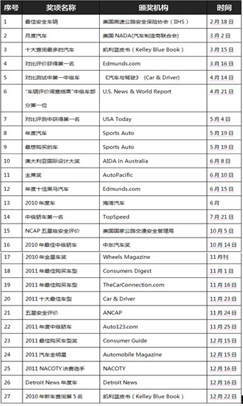 2010年2月,被美國高速公路安全保險(xiǎn)協(xié)會(huì)IIHS評選為“最佳安全車輛 (Top Safety Pick)”;