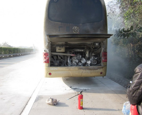 當(dāng)日下午4時10分,一輛載有30多名乘客的大客車在高速路上行駛,聽到警車喊話器喊話后,駕駛員這才發(fā)現(xiàn)大客車的后置發(fā)動機(jī)起火了,此時車上乘客慌亂一團(tuán),不知所措。火勢越來越大,油箱一旦著火就會發(fā)生爆炸,后果不堪設(shè)想。