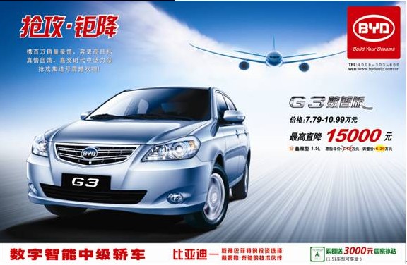 2月18日,比亞迪官方宣布,旗下F0、F3、F3R、G3、F6五款車型進行上市幾年來首次官方降價,其中G3車型最高降幅達15000元。如此大幅度的官方降價,在2011年可謂第一家,同時也再次點燃了消費者購車的欲望。