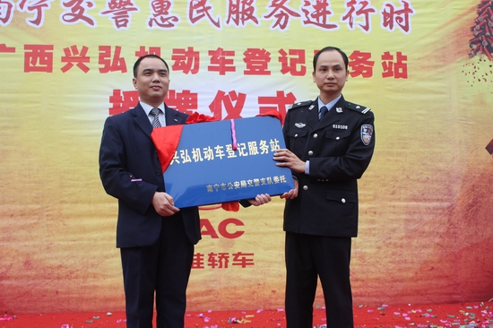 周副所長向廣西興弘陳謙副總經(jīng)理送上“機動車登記服務站”牌匾