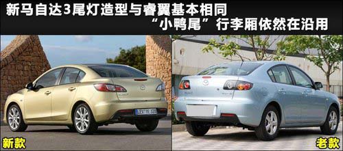 新款馬自達(dá)3的尾部設(shè)計(jì)還是能夠看出老款車型的影子,“小鴨尾”行李廂依然沿用在這款車上,但是在線條上顯得更為成熟。與前大燈相呼應(yīng)的是,新款馬自達(dá)3的尾燈由原來的圓形燈組改為了線條銳利簡潔的全新紅白樣式,但沒有采用熏黑式處理。