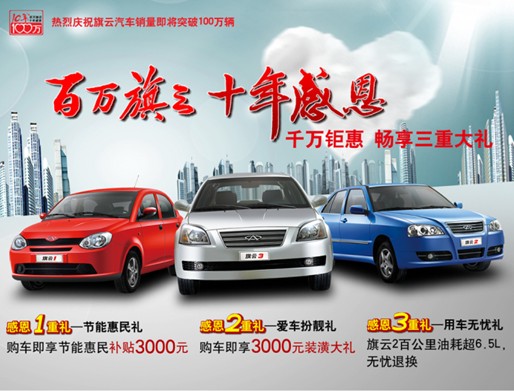 2001年,當(dāng)一款名為“風(fēng)云”的自主家轎產(chǎn)品從奇瑞汽車(chē)的生產(chǎn)車(chē)間下線時(shí),人們不會(huì)想到,十年后的今天,由它衍生的旗云系列轎車(chē)?yán)塾?jì)銷(xiāo)量已即將突破100萬(wàn)輛,旗云品牌也成為了具有深厚影響力、深受消費(fèi)者歡迎的大眾化家轎品牌。歷經(jīng)十年耕耘的旗云品牌,一路走來(lái)風(fēng)雨兼程,即將迎來(lái)百萬(wàn)收獲的欣喜。