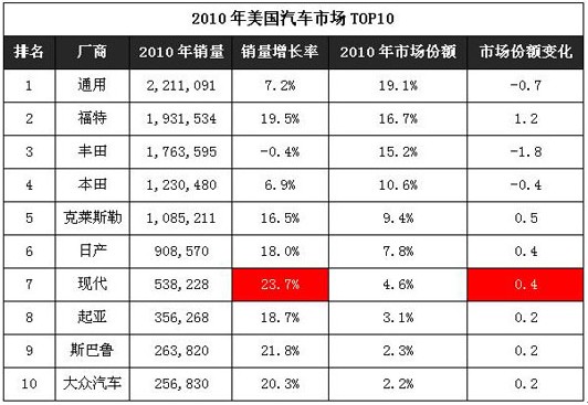 最新數(shù)據(jù)顯示,2010年美國新車銷量為1158.9萬輛,在美國經(jīng)濟回暖的背景下較上年增長11.1%,4年來首度止跌回升。雖然整體市場環(huán)境趨好,但各大汽車廠商的表現(xiàn)也不盡相同。