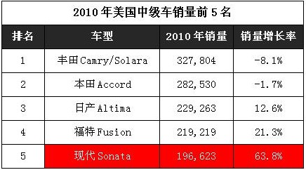 在美國前10大汽車廠商中,現(xiàn)代汽車以24%的增長率傲視群雄,成為2010年美國市場增長最快的主流汽車品牌。目前,現(xiàn)代汽車市場份額已經(jīng)由4.2%上升到4.6%,全年銷量突破53.8萬輛。能夠取得這樣的業(yè)績,主要應歸功于年初在美國上市第八代索納塔。憑借著出眾的設計和卓越的性能,該車在美國一炮而紅,全年銷量接近20萬輛,同比增長63.8%,躋身最暢銷的中級轎車之列,為現(xiàn)代汽車在美國的銷量提升和品牌形象做出巨大貢獻。
