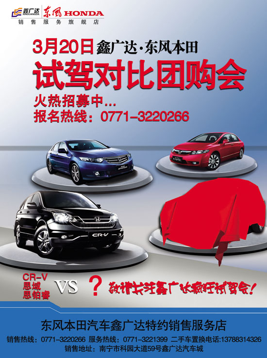 3月20日鑫廣達東風(fēng)本田的“三劍客”為尋求刺激的您舉行“大型試駕比拼團購會”,屆時會有專業(yè)講師為您推薦適合您的車型,為您演示“瘋狂的賽車”,還有趣味競賽,車型試乘試駕,吃的喝的,應(yīng)有盡有。“買車,養(yǎng)車,首選鑫廣達”快打電話預(yù)約吧。