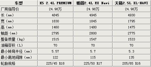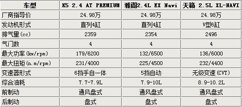 2010年3月10日,東風(fēng)悅達(dá)起亞最新款中級車K5正式上市,售價區(qū)間為15.98萬-24.98萬元。這個價位往往是中型車?yán)锔偁幾罴ち业,但K5最大的特點就是其個性化的外觀和全景天窗。K5上市后有很多競爭對手,同樣擁有24.98萬的天籟和雅閣在性能方面幾乎相差不多,盡管如此,這些品牌的內(nèi)部配置卻各有千秋,結(jié)合消費者的消費觀念,此次我們將這三款車進(jìn)行了全面的對比,看看K5有哪些優(yōu)勢。