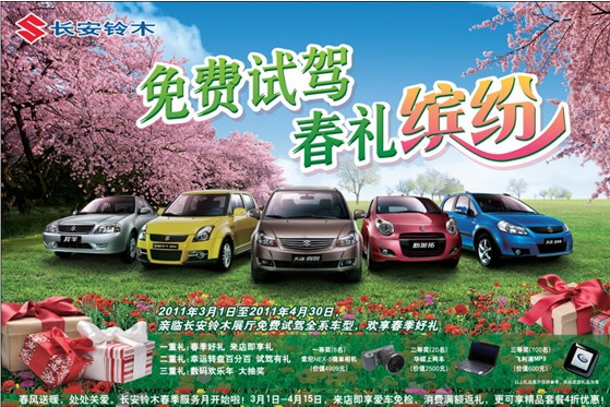 春風(fēng)送暖,長安鈴木繼2011年元旦推出“新年三重禮 繽紛歡樂送”的大型促銷活動之后,再次重磅出擊,推出了名為“免費試駕,春禮繽紛”的系列活動以回饋消費者。同時,長安鈴木的春季服務(wù)月也正式拉開序幕。在3月1日—4月15日,到店即享受愛車的免檢,消費滿額返禮,以及精品套餐4折優(yōu)惠。
