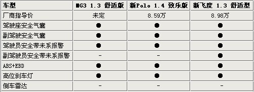 從以上表格可以看的出來,這三款A(yù)0級(jí)轎車雖然在安全方面都沒有獨(dú)特的表現(xiàn),但標(biāo)準(zhǔn)的安全配置都沒有缺省。因?yàn)檫@三款車型都是入門級(jí)配置,所以只標(biāo)配了雙安全氣囊和ABS+EBD,而飛度全系標(biāo)配了副駕駛安全帶未系報(bào)警,而新POLO和MG3則并沒有此配置。另外,這三款車型都沒有配備倒車?yán)走_(dá),讓大家覺得略顯遺憾。