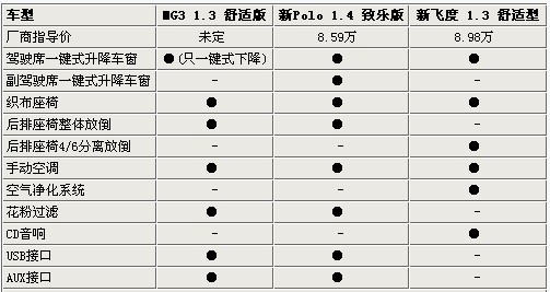 雖然這三款車都采用手動(dòng)空調(diào),但都配備了凈化裝置,其中MG3和新POLO配備了花粉過濾系統(tǒng),而新飛度配備了空氣凈化系統(tǒng),能減輕車內(nèi)不少的異味。在娛樂配置方面,這三款車基本可以滿足年輕消費(fèi)者的需求,MG3和新POLO雖然沒有配備CD音響,但設(shè)計(jì)了USB接口和AUX音頻接口便于擴(kuò)展;而新飛度只配備了CD音響,卻沒有更多的擴(kuò)展插口。