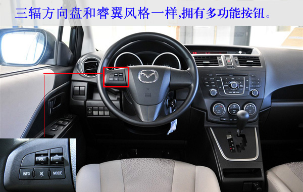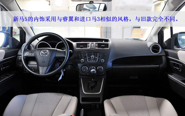 新款馬自達(dá)5采用全黑內(nèi)飾,在中控臺、換擋桿、方向盤和車門等部位上還配有大量銀色裝飾條。新增加的配置還包括了更先進(jìn)的多功能方向盤等,該車與老款一樣擁有7個座椅,包括前兩排5個固定座椅和第三排的兩個可拆卸座椅,并通過第二排座椅的獨特多功能及折疊機(jī)構(gòu),實現(xiàn)多種座椅布局。