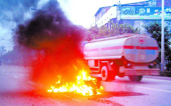當(dāng)日下午6點(diǎn)50分,筆者聞?dòng)嵹s到金海灣東大街時(shí),遠(yuǎn)遠(yuǎn)看到金海大橋頭東面是濃煙滾滾,筆者在現(xiàn)場看到,一輛女式兩輪摩托車倒在路中起火燃燒,大火燒得正旺。據(jù)女式摩托車的車主玉女士介紹,當(dāng)時(shí)她下班回家騎車經(jīng)過此地,當(dāng)時(shí)她是沿著金海灣大街由西往東行駛,當(dāng)她行駛至金海大橋東橋頭附近時(shí),突然感覺到車輛被重重地撞上,她是連人帶車跌倒在地,當(dāng)她掙扎爬起來時(shí),發(fā)現(xiàn)撞她的是一輛墨綠色的皮卡車,皮卡車撞倒她后,一刻也不停留,而是直接逃離了現(xiàn)場。玉女士本想追上去,但是,她發(fā)現(xiàn)自己的摩托車已經(jīng)起火燃燒了。不好,車座下面車箱內(nèi)還放著自己的包,包中裝著各種證件、手機(jī)和9000元公款,玉女士來不及多想,便欲沖上去搶出自己的包,無奈,車箱是鎖著的,根本無法打開車箱,因?yàn)閾?dān)心車輛會(huì)爆炸,玉女士只好逃離了現(xiàn)場,在旁邊眼睜睜看著自己的證件、手機(jī)和9000元公款被大火吞噬。