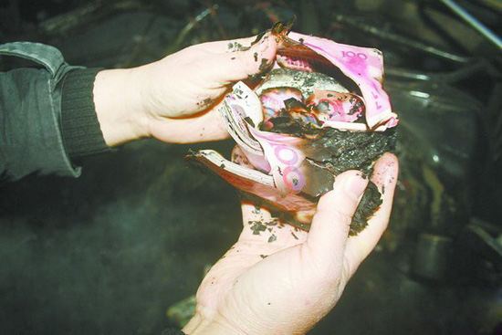 在筆者采訪的時(shí)候,119的急救車也聞?dòng)嵹s來救火,可惜已經(jīng)來不及了,摩托車已經(jīng)被燒得只剩下一個(gè)鐵架了。在消防人員將火完全撲滅后,玉女士在灰燼中找到一沓基本被燒毀的100元大鈔,看到公款已經(jīng)完全被燒毀,玉女士是心疼不已。