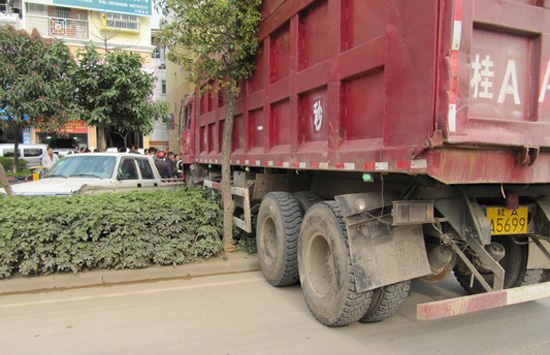 當天下午4點35分左右,貴港交警一大隊事故處理中隊值班室接110指令:在貴港市仙衣路馬草江公園路段,一輛大貨車在倒車時碰撞到一輛面包車和一輛皮卡車,現(xiàn)場有大量群眾圍觀。接警后,一大隊事故處理中隊民警迅速抵達現(xiàn)場處置。經(jīng)民警到達現(xiàn)場初步調查獲知:下午4點20分,大貨車在事故路段倒車過程中因制動系統(tǒng)失靈,導致該貨車失控后跨過道路旁的綠化帶,碰撞到停在路邊的一輛小客車和一輛皮卡車,造成三車不同程度損壞的道路交通事故。